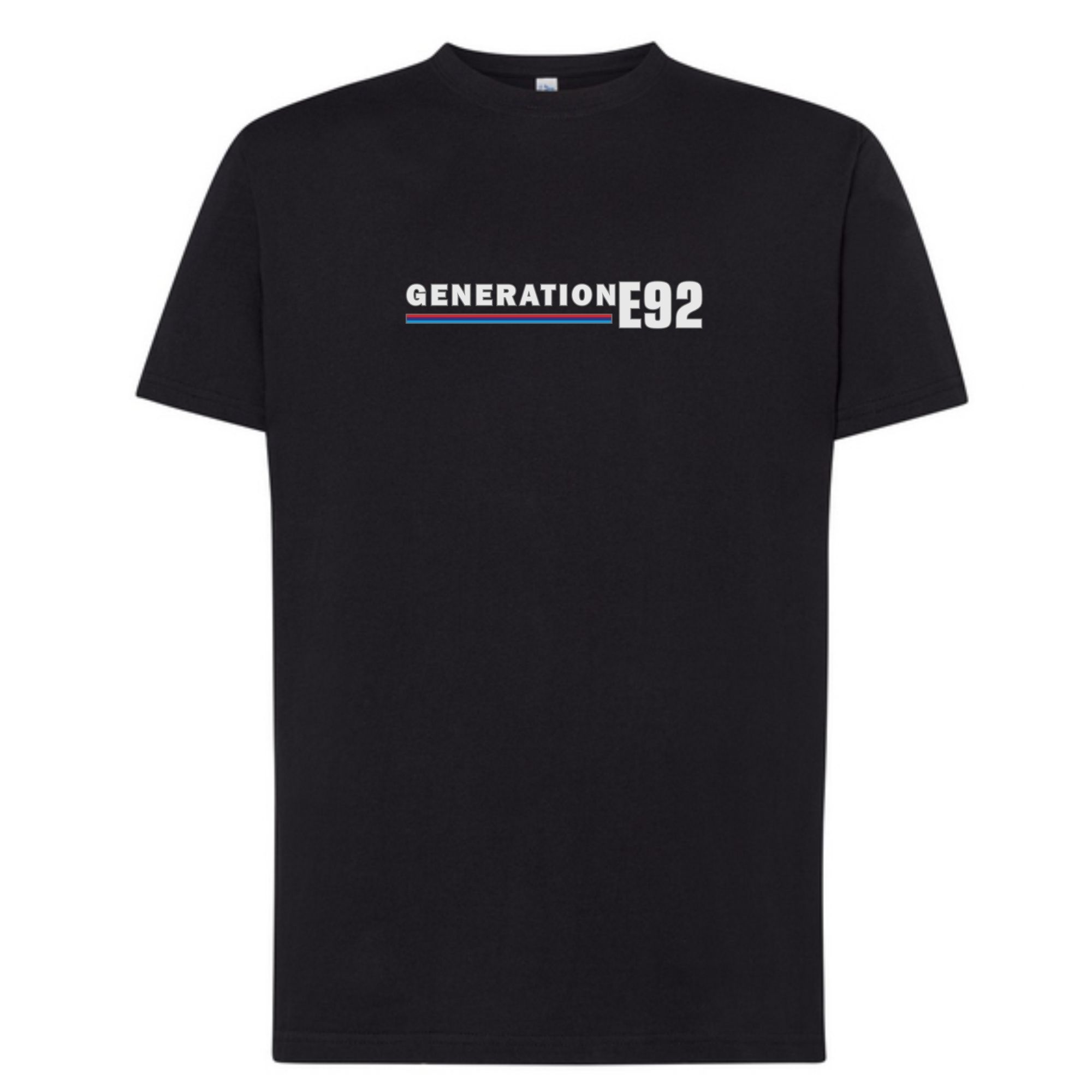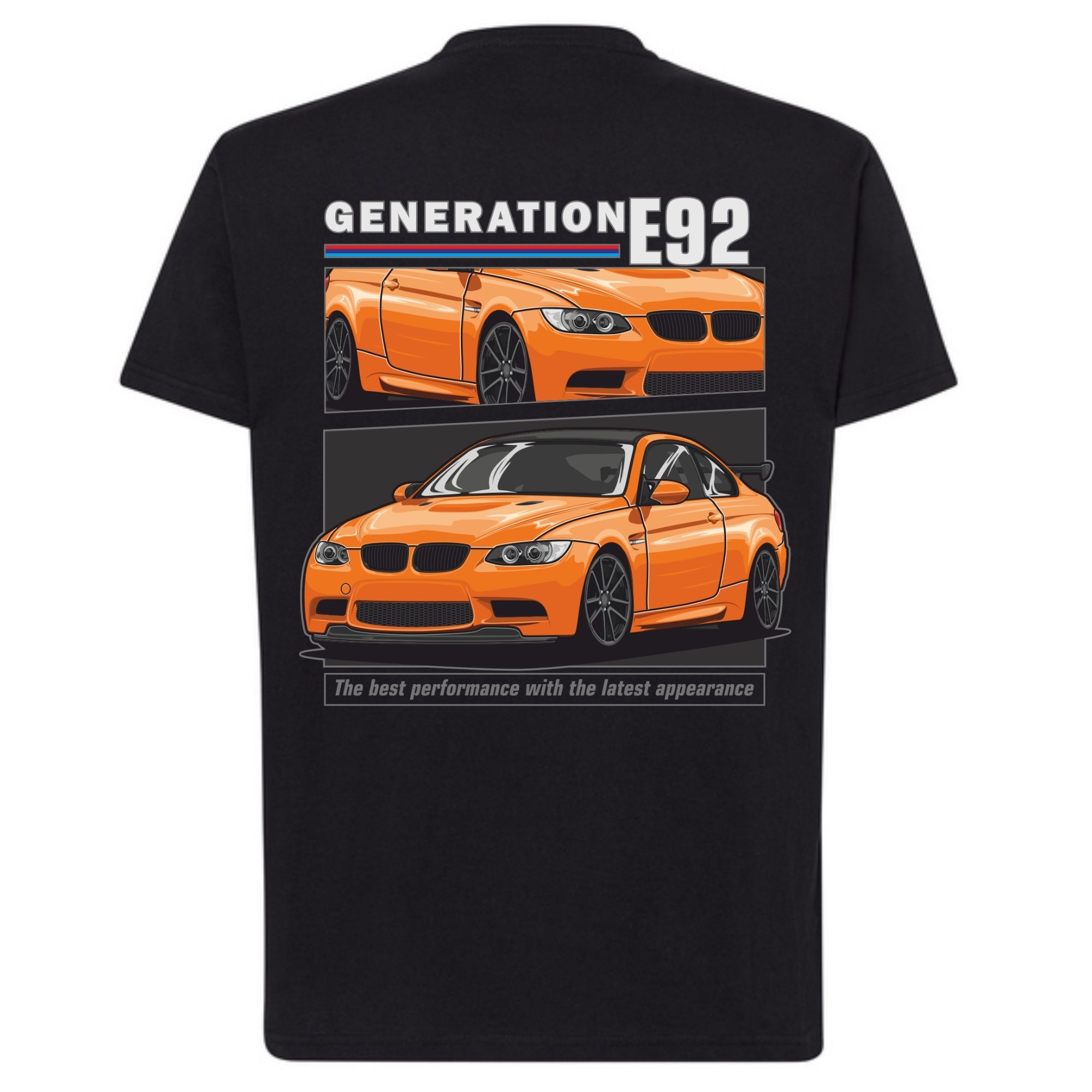 Camiseta RACEDAYS negro con diseño propio y exclusivo “Generación E92” en impresión DTF tanto en la parte delantera como en la trasera, de manga corta, cuello redondo y en 100% algodón. Gramaje: 190 gr. aprox.